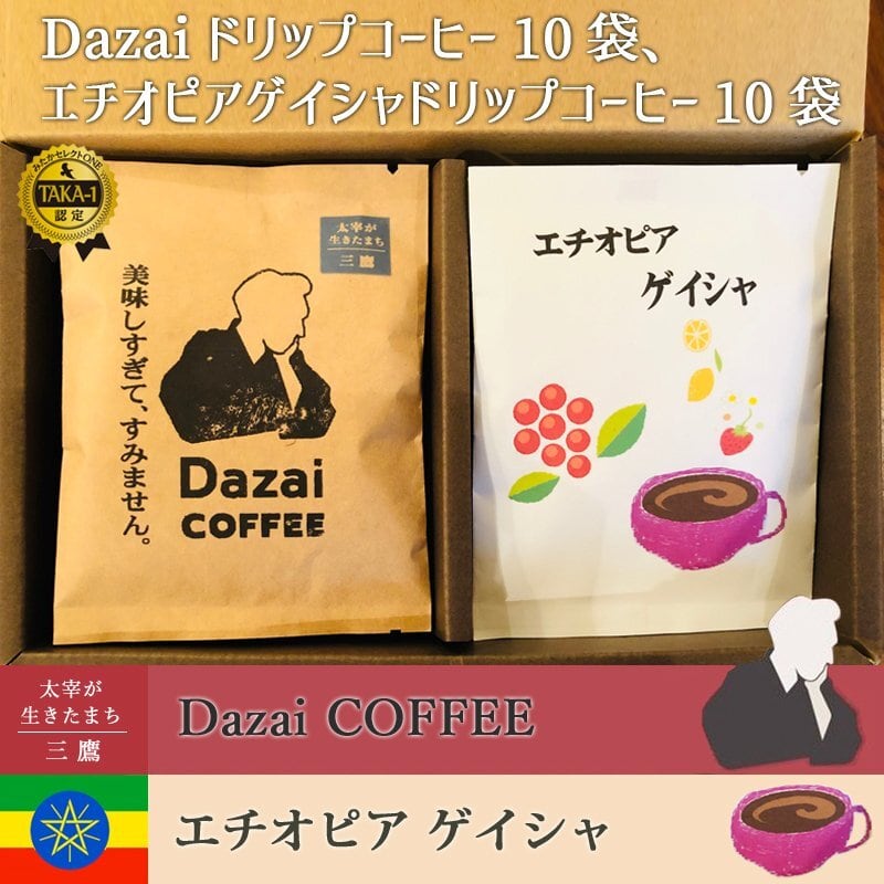 「深くビターな味わい」dazaiドリップコーヒー10袋、「“幻”や“伝説”と呼ばれるゲイシャ」エチオピア ゲイシャ10袋のセットです。