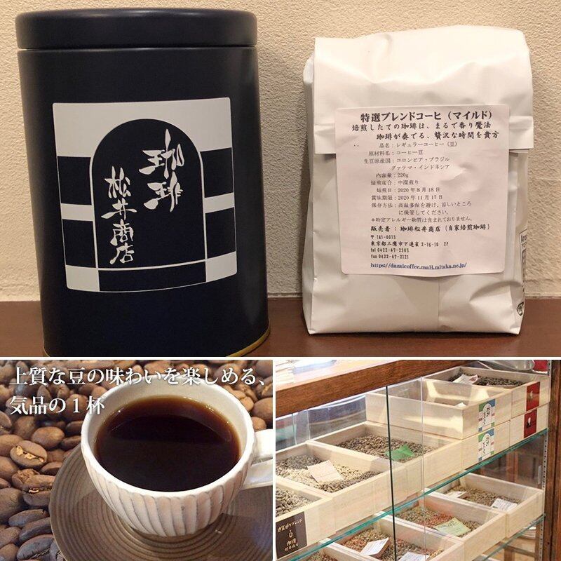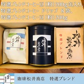 特選ブレンドコーヒー豆(粉か豆)200g缶入り、特選ブレンドコーヒードリップコーヒー8袋、特選ブレントコーヒー豆(粉か豆)200gのセットです。